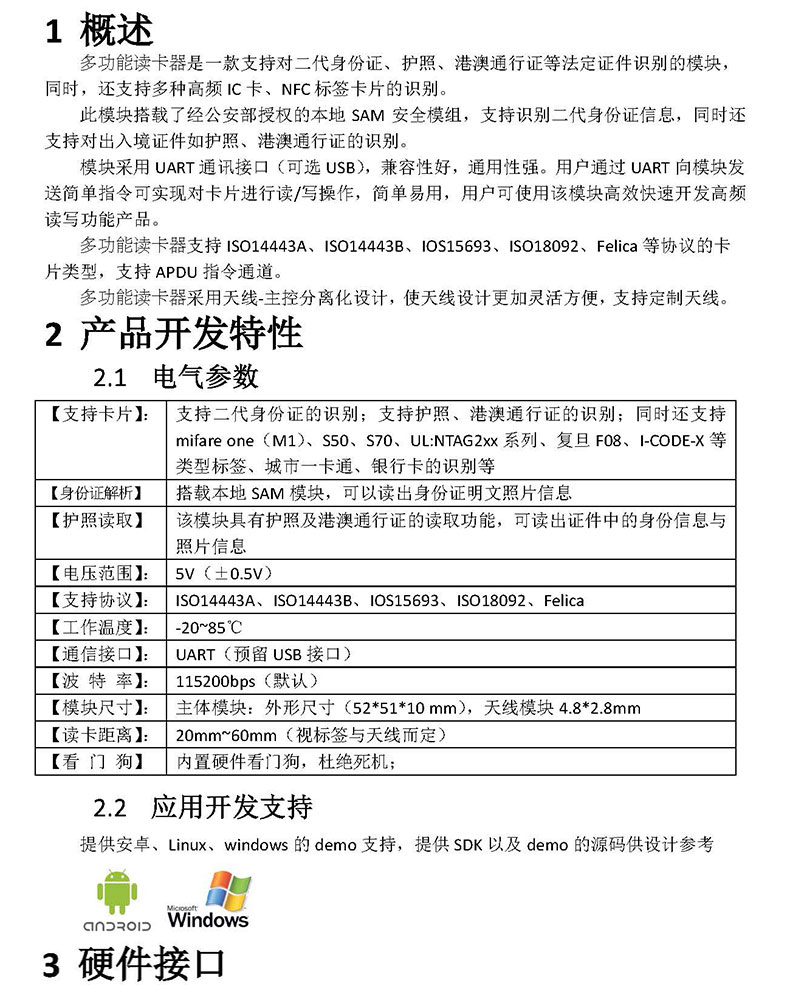 多功能讀卡器是一款支持對二代身份證、護(hù)照、港澳通行證等法定證件識別的模塊,同時(shí),還支持多種高頻 IC 卡、NFC 標(biāo)簽卡片的識別。