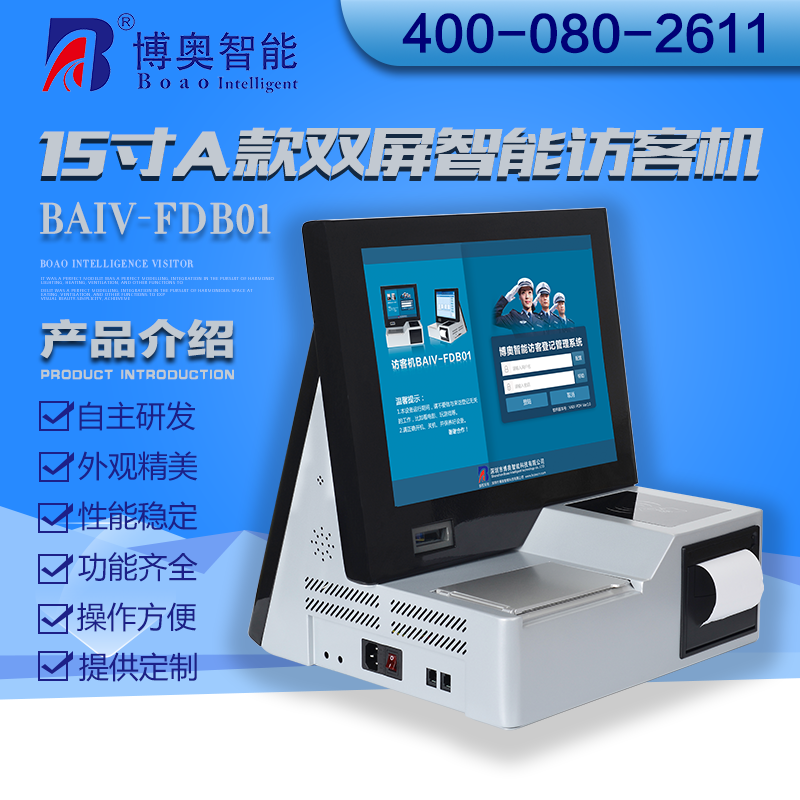 ? ? ? 15寸B款雙屏智能訪客機(jī)是博奧智能自主開發(fā),采用人體工程學(xué)與模塊化設(shè)計(jì)相結(jié)合,融合計(jì)算機(jī)、觸摸屏手寫、證件識別(OCR),射頻識別、指紋生物識別、熱敏打印、條碼、數(shù)碼攝像、自動制證、硬件加密、網(wǎng)絡(luò)等技術(shù);選用鈑金材料、表面噴粉工藝加工出來的一款訪客管理終端,訪客管理終端內(nèi)部裝有WIN7操作系統(tǒng)SQL Server數(shù)據(jù)庫及我公司自主開發(fā)的訪客登記管理軟件等主要軟件,從而匯集成了一套完善的智能訪客登記管理系統(tǒng),它具有外觀精美,功能完善,操作方便等特點(diǎn)。