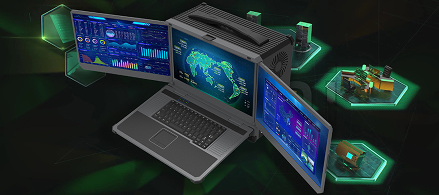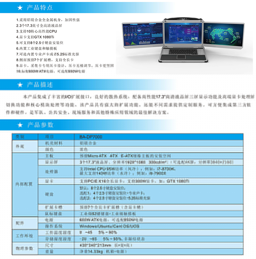 便攜式三屏計算機采用鋁鎂合金全金屬機身,加固性強,外觀精美,體積輕巧,方便攜帶,達到工業(yè)級性能;本產(chǎn)品集成了豐富的I/O擴展接口, 良好的散熱系統(tǒng), 配備高性能17.3"高清液晶屏,三屏顯示功能及高端顯卡處屏切換功能和核心模塊處理等功能, 該產(chǎn)品具有強大的擴展功能, 還能不同需求提供定制服務??煞奖慵傻谌浖陀布J擒婈?、公共安全、現(xiàn)場服務和其他特殊應用領(lǐng)域的最佳解決方案!