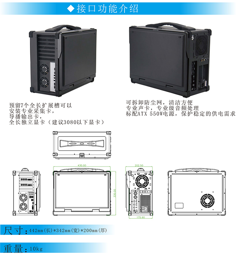 廣電影視導(dǎo)播直播錄播系統(tǒng)一體計(jì)算機(jī)工業(yè)級(jí)加固防振室外高亮便攜式17.3寸工控電腦支持定制加工國產(chǎn)系統(tǒng),采用鋁鎂合外殼,體積輕巧,性能穩(wěn)定,方便攜帶等特點(diǎn);集成導(dǎo)播鍵盤、音頻模塊、視頻加速卡、導(dǎo)播輸出卡、17.3寸高亮屏,保證戶外使用也清晰可見,用于廣電行業(yè)和教育行業(yè)的專業(yè)級(jí)導(dǎo)播/直播便攜設(shè)備。