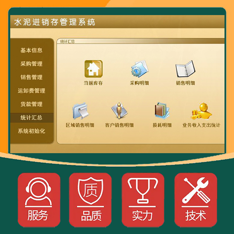 6. 統(tǒng)計匯總:提供當前庫存、采購明細、銷售明細、區(qū)域銷售明細、客戶銷售明細、損耗明細、業(yè)務(wù)收入支出統(tǒng)計等數(shù)據(jù),助力企業(yè)分析經(jīng)營狀況,優(yōu)化管理策略。水泥行業(yè)最佳解決方案,進銷存管理系統(tǒng),現(xiàn)貨供應(yīng),免費試用一次,購買永久使用!